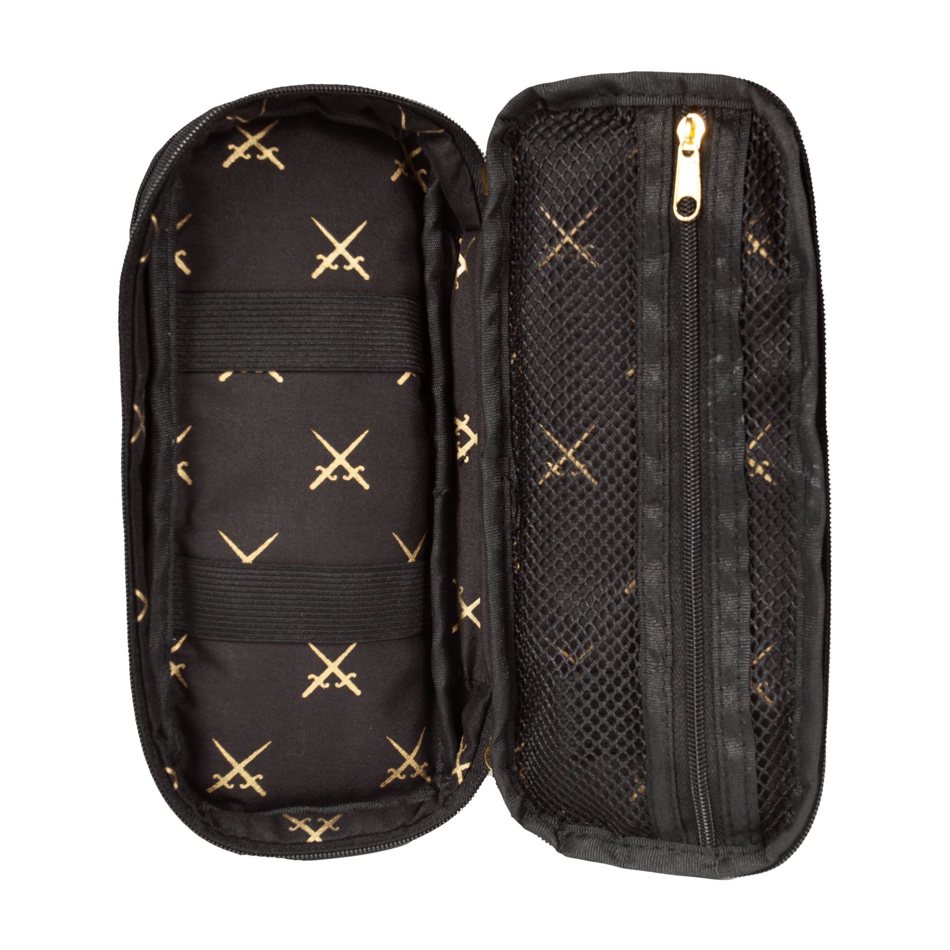 Front Zipper Pocket: Made uniquely with left mesh pocket to hold an assortment of items and/or presciption note and right side made with 2 elastic bands to hold Stealth Shuttles, Larger Injection Pens, 10ml vials of medication etc..